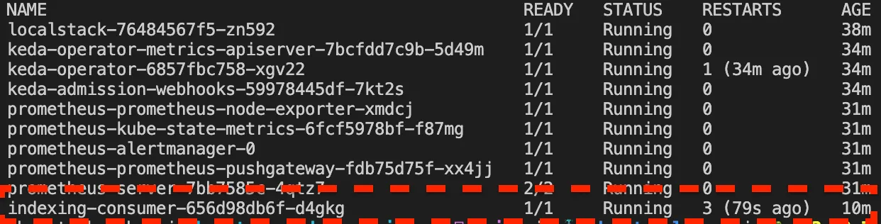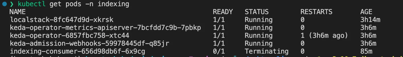 Now that we have LocalStack and KEDA deployed to our Kubernetes cluster, we can start deploying our indexing consumer. The indexing consumers are deployed as Kubernetes deployments by using a deployment file deployment-consumer.yaml.